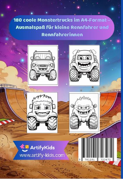 180 verschiedene Monstertrucks im A4‑Format – von niedlichen Cartoon‑Trucks über witzige Monster‑Gesichter bis hin zu extra starken Offroad‑Boliden.